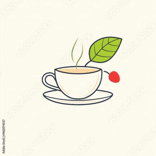 Obraz premium Simple teacup illustration, light background, steaming drink, decorative leaf, use for tea shop, logo, or poster