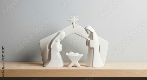 Obraz premium Simple white ceramic holy family nativity scene on wooden shelf, representing...