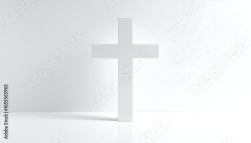 © upin, Naklejka premium Simple white cross standing on a white reflective surface against a white wall