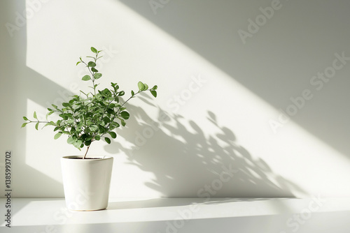 © azvector, Fototapeta premium Simple white desk with a potted plant and blank calendar in bright sunlight and soft shadows — ideal for minimalist themes or productivity visuals.