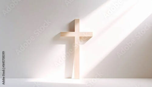 © Cheiraa, Naklejka premium Simple wooden cross illuminated by sunlight against a stark white wall.