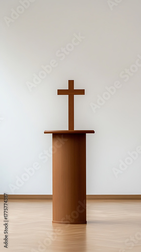 Naklejka premium Simple wooden cross on podium, standing alone in bright church setting. The unadorned space evokes peace, reflection and spiritual contemplation in minimalist style.