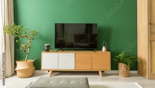 © Sadaqat, Obraz premium Simplicity in Green: A Minimalist Muji-Inspired Living Room with TV on Cabinet"