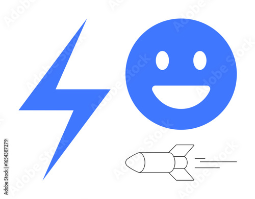 Naklejka premium Simplified blue happy face, bold lightning bolt, and minimal rocket with motion lines represent energy, efficiency, innovation, technology, power, motion and vibrance. Ideal for startups marketing