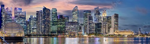 © Elias Bitar, Naklejka premium Singapore CBD City Skyline on the river at Sunset with vibrant colours of the high-rise apartment and office towers with the beautiful colours of the sky. Panorama view of Singapore CBD buildings