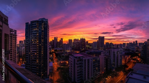 © THUA, Fototapeta premium Singapore downtown towers silhouetted against a fiery sunset, the twilight sky transitioning into deep indigo, the city modern architecture glowing with a mix of natural and urban light