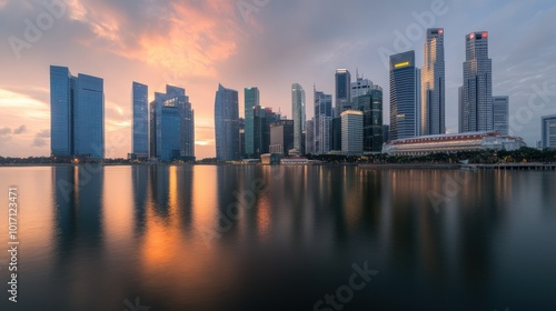 © Rere_Art151, Naklejka premium Singapore Skyline with Reflections and a Pink Sunset
