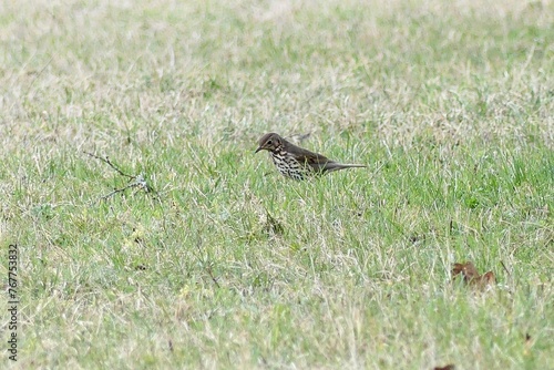 Fototapeta premium Singdrossel bei der Futtersuche auf einer Wiese