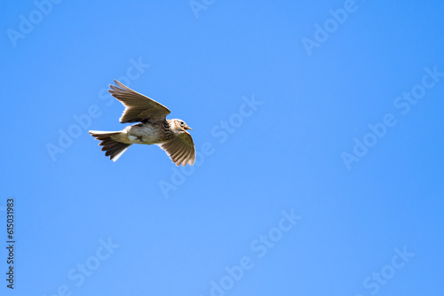 © Karin Jähne, Obraz premium Singende Feldlerche im Flug