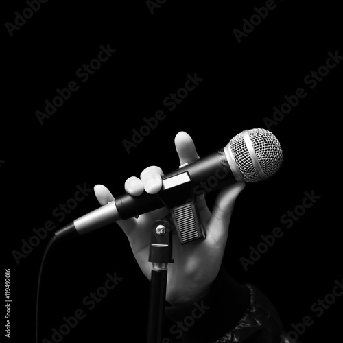 Fototapeta premium singer right hand holding dynamic microphone, bw filter & isolated on black (...