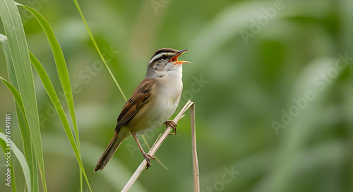 © Sugiri80, Fototapeta premium Singing Bird on Reed: A Serene Nature Photograph