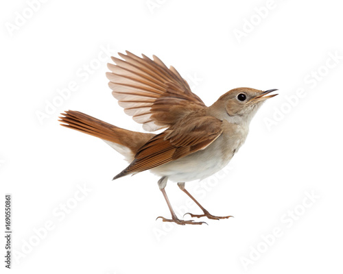 Fototapeta premium Singing common nightingale bird with its wings spread open, on a png transparent background