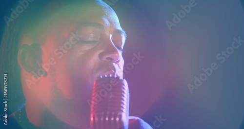 Fototapeta premium Singing male singer wearing dark shirt, holding retro microphone on stage with colored spotlights
