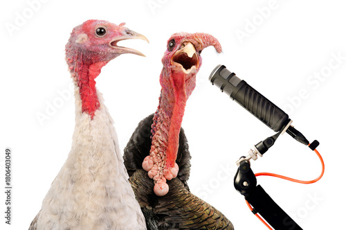 © fotomaster, Fototapeta premium Singing turkey at the microphone isolated on white background