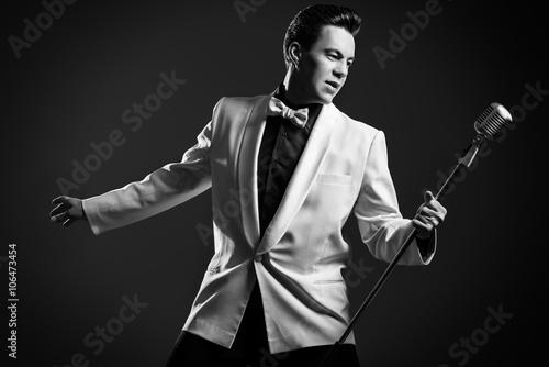 © Andrey Kiselev, Fototapeta premium singing with microphone