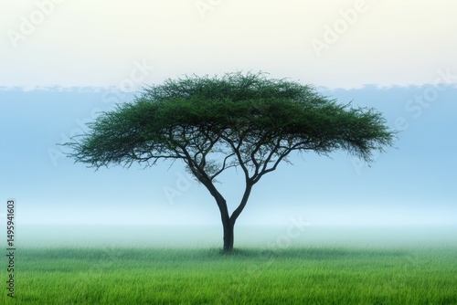 © bigkage, Obraz premium Single acacia tree standing alone in a vast open grassy field surrounded by soft morning fog and muted light, creating a peaceful minimalistic nature landscape composition