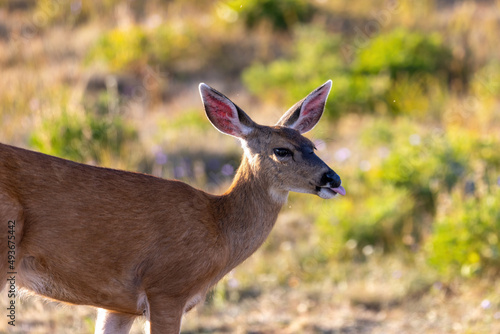 Fototapeta premium single adult deer walking through a field covered in tall grass