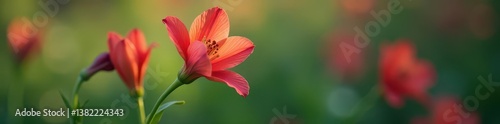 Fototapeta premium Single alstroemeria stem, delicate petals, soft focus background , nature, red, greenhouse
