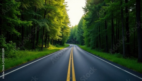 Fototapeta premium Single asphalt lane winding through dense forest, nature, lane, highway