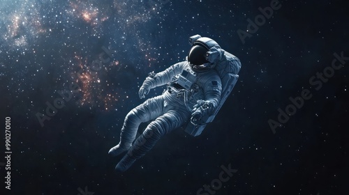 Fototapeta premium Single astronaut floating in space with dust and stars, created using...