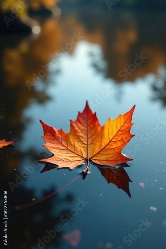 Fototapeta premium Single autumn leaf floats on still, reflective water Tranquil fall scene ,...