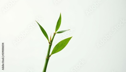 © Theerawat, Fototapeta premium Single bamboo stalk, delicate leaves, crisp white backdrop , stem, isolated