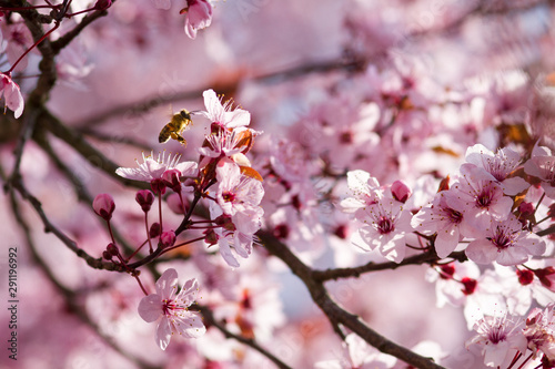 Fototapeta premium single bee searching for nectar in pink tree blossoms