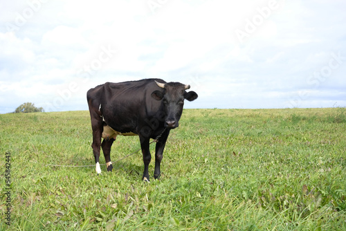 Fototapeta premium single black cow is grazing in a meadow in countryside