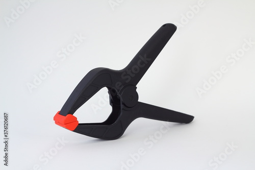 © bt1976, Obraz premium Single black plastic spring clamp isolated over white background