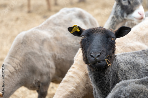 © bzzup, Fototapeta premium Single black sheep looking at the camera