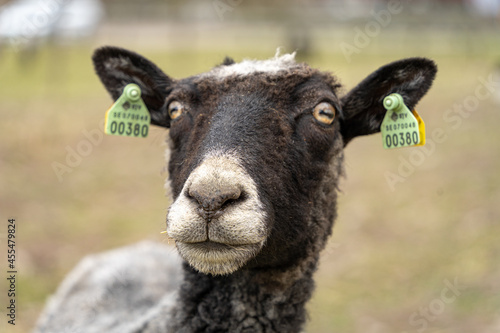 © bzzup, Fototapeta premium Single black sheep looking at the camera