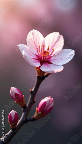 Fototapeta premium Single blooming almond flower on a thin, curved twig with gentle light,...