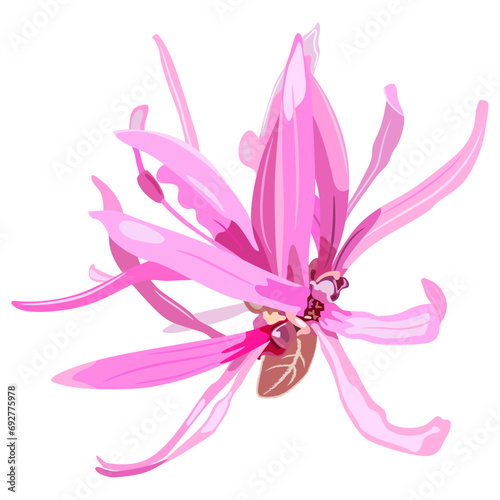 Naklejka premium Single blooming flower of Loropetalum Chinense plant. Pink blossom. Chinese fringe flower or strap flower. Isolated vector illustration.