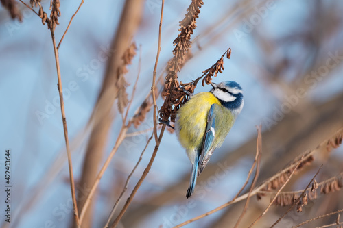 Naklejka premium Single blue tit sitting on the bush