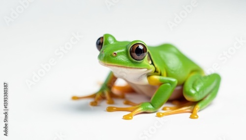 Naklejka premium Single bright green frog on pure white backdrop, stark contrast, single,...