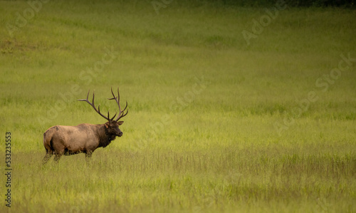 Naklejka premium Single Bull Elk Stands In Green Field