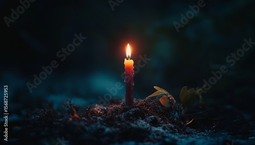 © Jamiel, Fototapeta premium Single candle illuminates dark forest floor