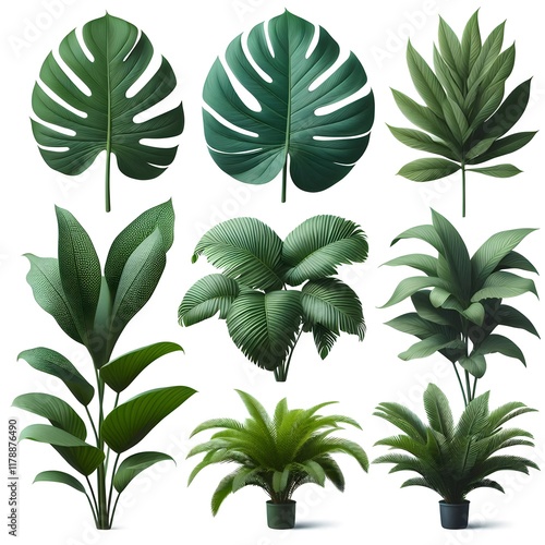 Fototapeta premium Single Collection of Green Tropical Plant Leaves ( Monstera, Palm, Rubber Plant, Pine, Bird's Nest Fern) Isolated on White Background with Cutout Path