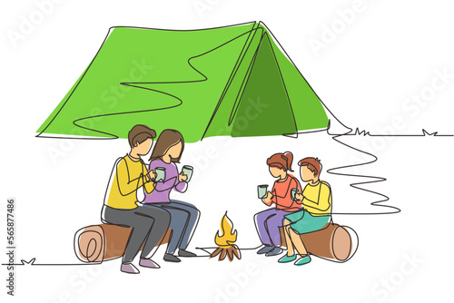 Fototapeta premium Single continuous line drawing happy family camping with campfire at night. Drinking tea sitting on logs in forest. Father, mother and children hiking concept. One line draw design vector illustration