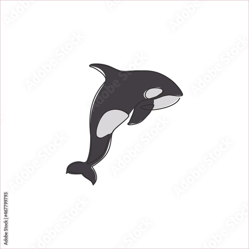 Naklejka premium Single continuous line drawing of big adorable orca for company logo identity. Endangered whale mascot concept for national fish conservation icon. Modern one line draw design vector illustration