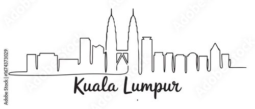 © Mofazzelh, Naklejka premium Single continuous line drawing of Kuala Lumpur city skyline, Malaysia. Famous city landscape. World travel concept home wall decor art poster print. Vector black silhouette. with white background