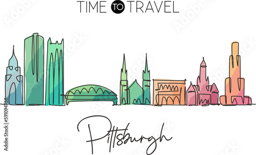 © Simple Line, Obraz premium Single continuous line drawing of Pittsburgh city skyline, Pennsylvania. Famous city landscape. World travel concept home wall decor print poster art. Modern one line draw design vector illustration
