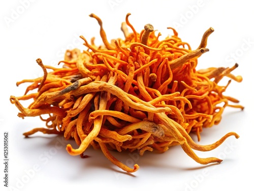 Fototapeta premium Single Cordyceps Militaris Mushroom Standing on White Background