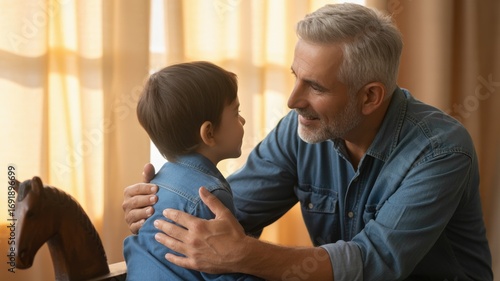 © Tonton1541, Fototapeta premium single dad son talking concept. A man shares a tender moment with a young boy indoors.
