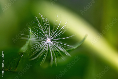 © Jadranka, Fototapeta premium Single dandelion seed in green environment Macro view of a single dandelion seed against a soft green background with gentle light.
