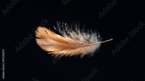 © BozStock, Obraz premium Single, delicate feather floating against a black background.
