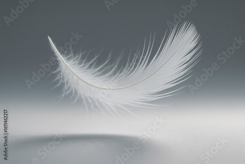 Obraz premium Single delicate feather floating mid-air with fine filaments gently curved in light and soft contrast