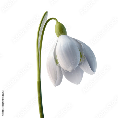 © Tungbackground, Obraz premium Single Delicate Snowdrop Flower with Water Droplets, Isolated on Green Transparent background