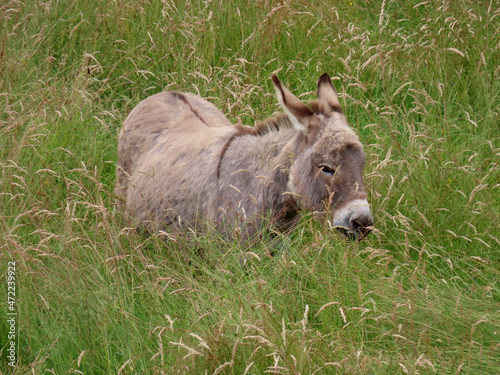 © Ilona Lablaika, Fototapeta premium Single donkey in lush green pasture standing, grazing the tall grass up to it's ears