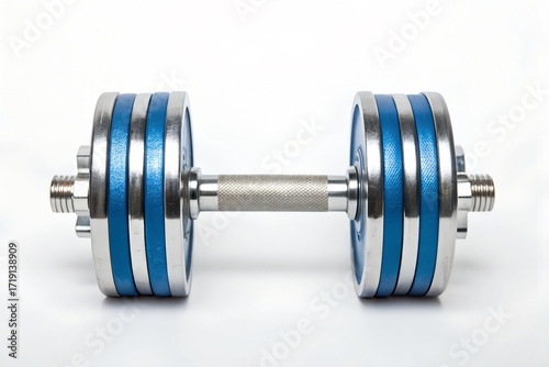 Fototapeta premium Single dumbbell with metallic handle and silver weight plates featuring blue stripes on white background